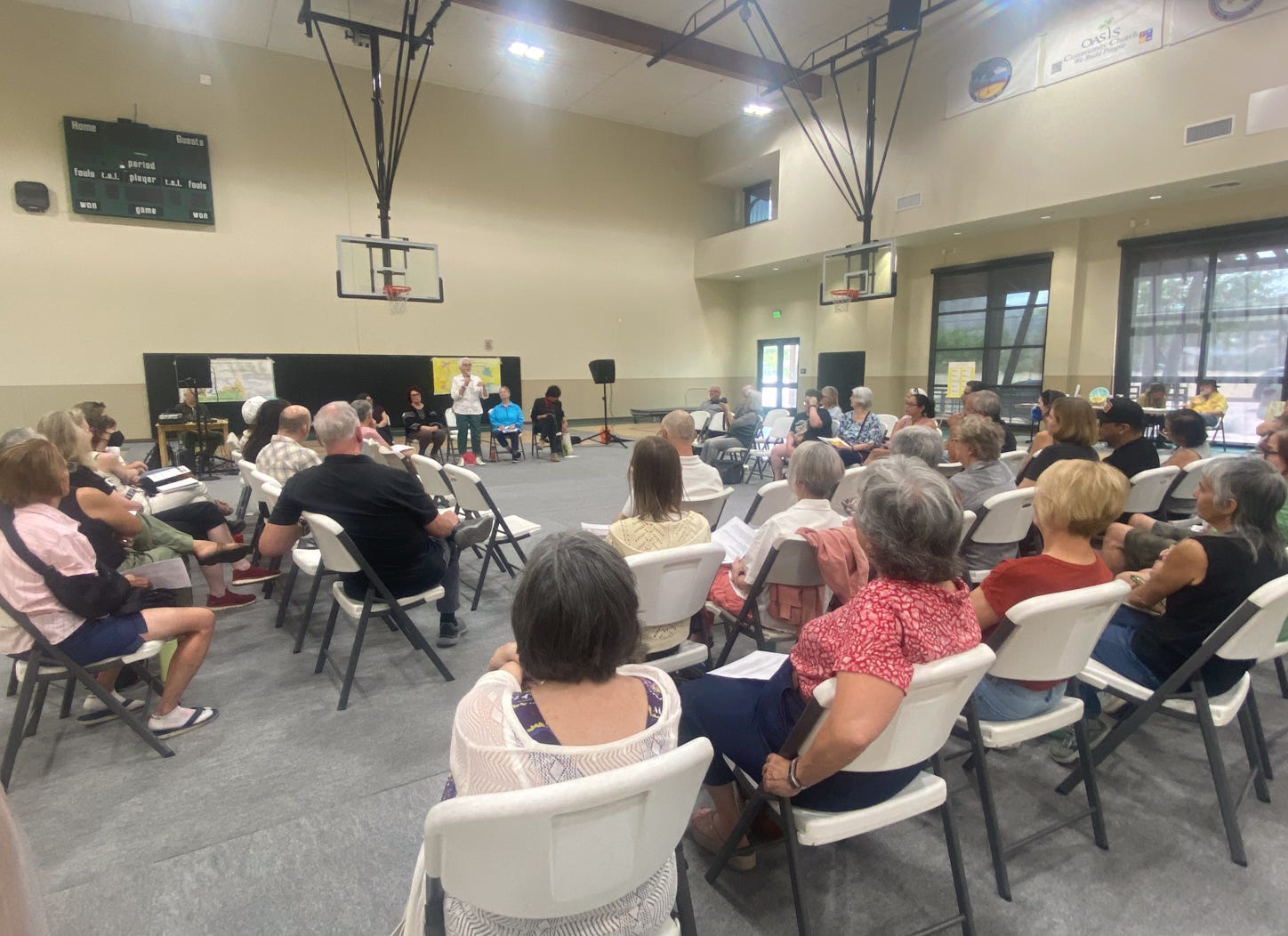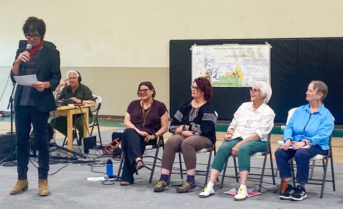 How can our communities balance economic development with the need to conserve and protect critical desert environments? This topic, and tension, was the focus of the Finding Balance Town Hall, which took place on Saturday, May 31, at the Twentynine Palms Community Center. The conversation was hosted by the Morongo Basin Conservation Association (MBCA) and the Indian Cove Neighbors Organizing Committee. It was moderated by Cindy Bernard, editor of the Desert Trumpet. The afternoon featured presentations from Kat Talley-Jones, sitting in for Luke Basulto of the National Parks Conservation Association; Pat Flanagan and Laraine Turk of the Morongo Basin Conservation Association; and Rich Good, local business owner, and musician. Bernard, Talley-Jones, and Good are also all members of the Indian Cove Neighbors Organizing Committee. Twentynine Palms Parks and Recreation provided the gym space for the meeting, which was attended by about 60 community members from throughout the Morongo Basin,