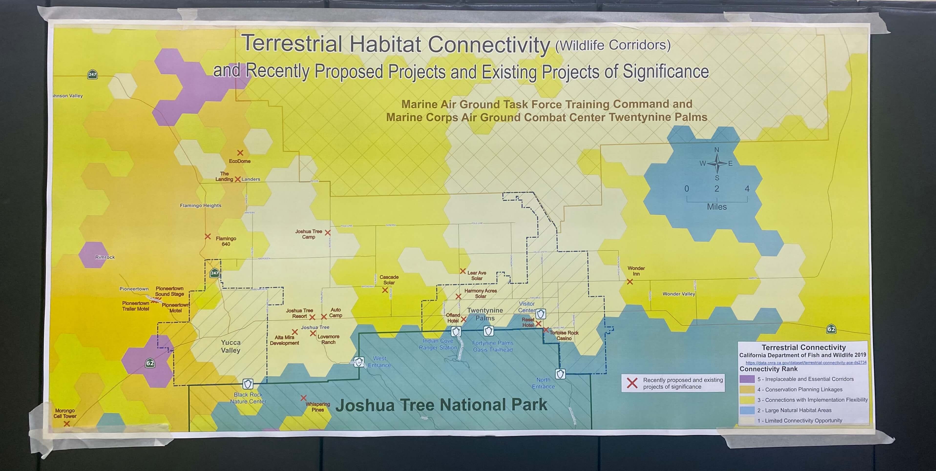 Open spaces of the desert are essential homes for wildlife, including desert tortoises, kit foxes, badgers, migratory birds, and pollinators. Talley-Jones emphasized the importance that the open lands in the Morongo Basin, such as Joshua Tree National Park and the 29 Palms Marine base, serve as corridors for wildlife, bridging other open spaces such as BLM-managed land and the Mojave National Preserve, and supporting desert species’ ability to adapt to heat, drought, and long-term climate shifts.