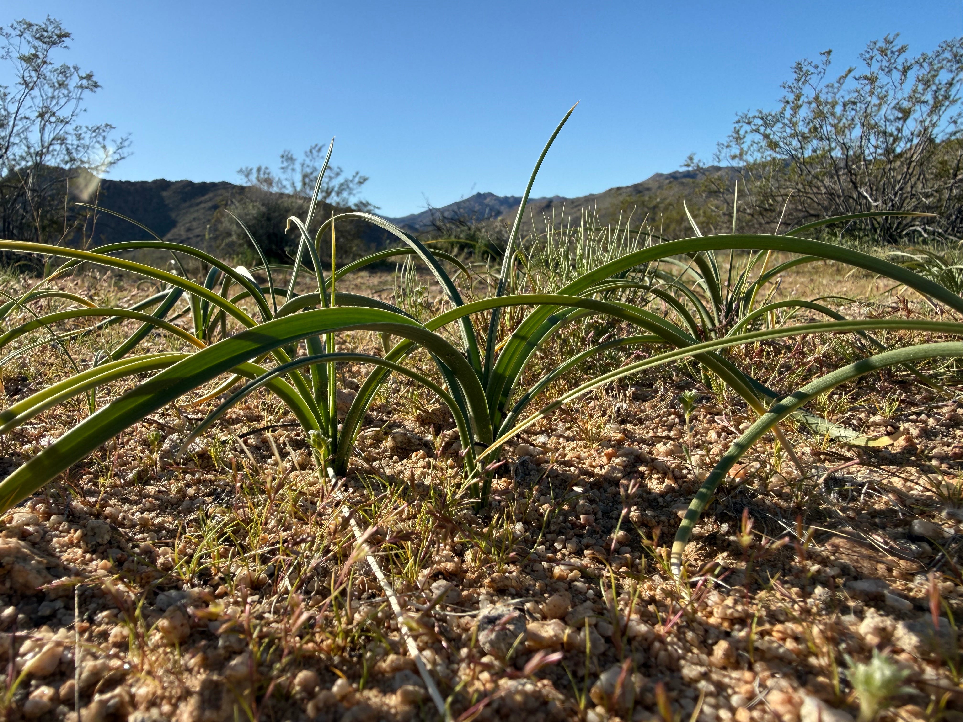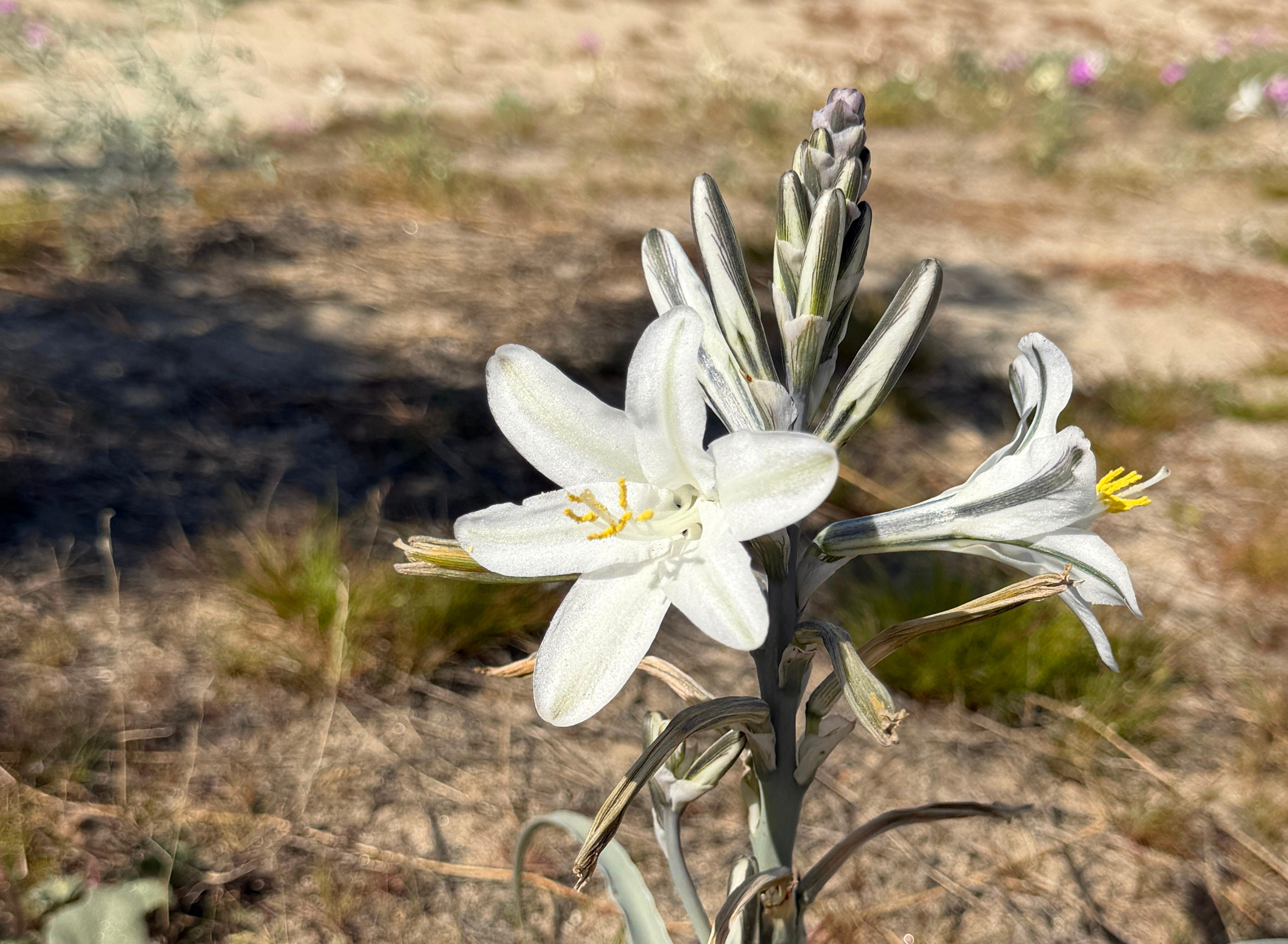 As a group, geophytes are textbook survivalists, hunkering down in their sunken bunkers and hoarding energy supplies through lean years, periodically surfacing to make food using sunlight energy to set aside even more stores. Wild Hyacinth, Wild Rhubarb, and Desert Death Camas share prepper strategies with fellow stunners Desert Mariposa Lily (Calochortus kennedyi) and Desert Lily (Hesperocallis undulata), also giving us glorious displays this year.