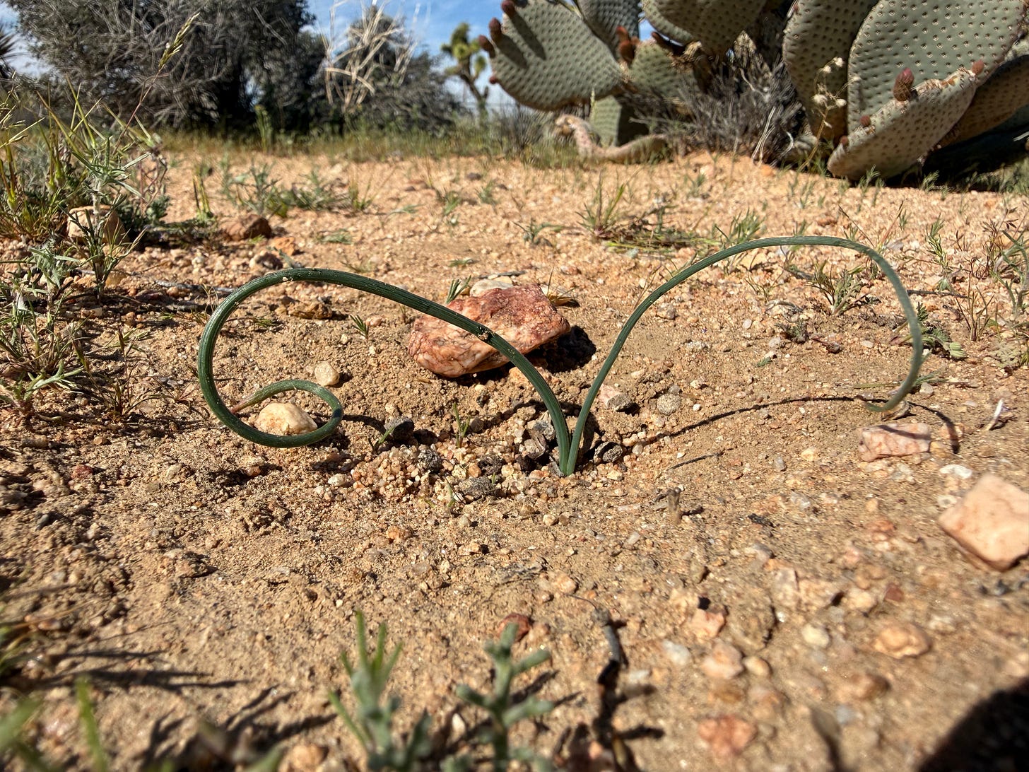 But by digging below the surface, literally right down into the ground, one uncovers a special group of plants that are really on a high this season, and Wild Hyacinth, Wild Rhubarb, and Desert Death Camas are three of the more elusive beauties on parade. They’re geophytes - translated from the ancient Greek of botany as Earth Plants. Spending a good part of their lives hidden asleep in the soil, they bide their time in dormancy until roused by favorable conditions. Broadly put, geophytes are storage vessels that hold plant life in suspended animation underground, sheltered from adversity such as drought and fire. These cagey soil-dwellers paint a picture of resilience, stubbornness, and even danger.