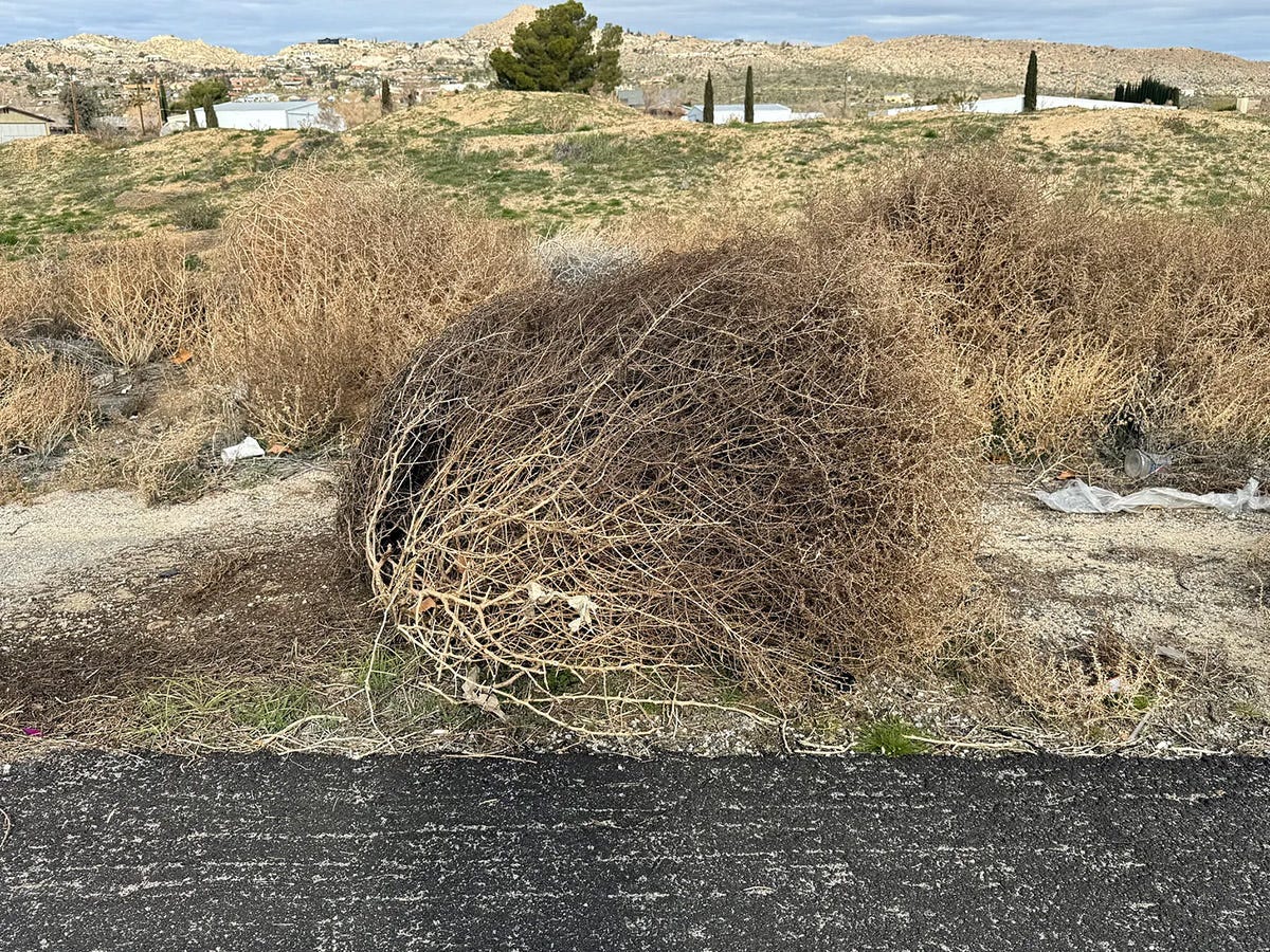 To further illustrate its hypnotic power over us, we assist its quest for global domination by taking tumbleweeds home as souvenirs or yard art and ship them out globally as Etsy chandeliers or party decor. In these parts, they’ve beguiled us into thinking that the easiest method of dispatch is dragging the ground, while in reality we’re doing their bidding by sprinkling their seeds into the broken soil they so prefer.