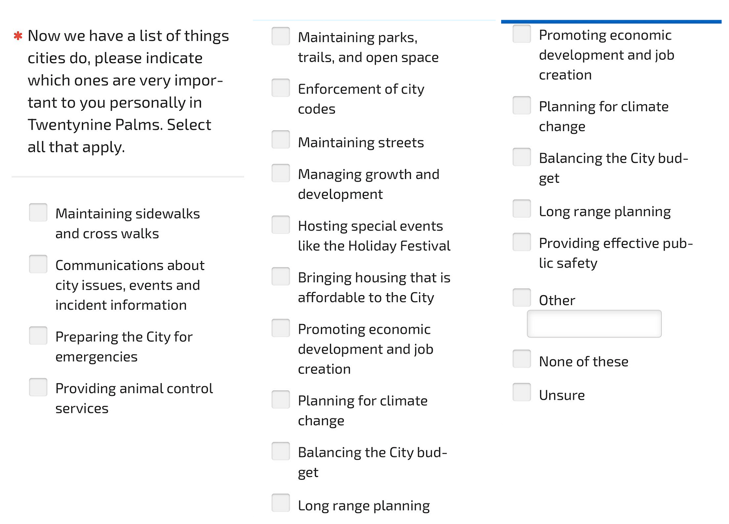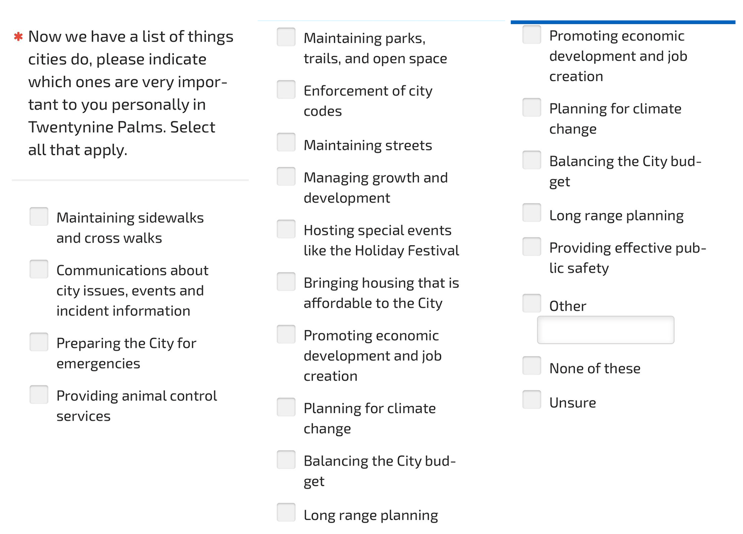 Viewing the same list, respondents were also asked, “Thinking of the same list of things cities do, please indicate which ones you are satisfied with in Twentynine Palms. This yielded a top three of “Providing animal control services” (46.3%), “Maintaining parks, trails, and open space” (36.7%) and “Hosting special events like the holiday festival” (34.3%). However, the headline doesn’t quite match the categories and drops “open space” from the second most popular result: “Residents are most satisfied with animal control, parks and trails, and community events.”