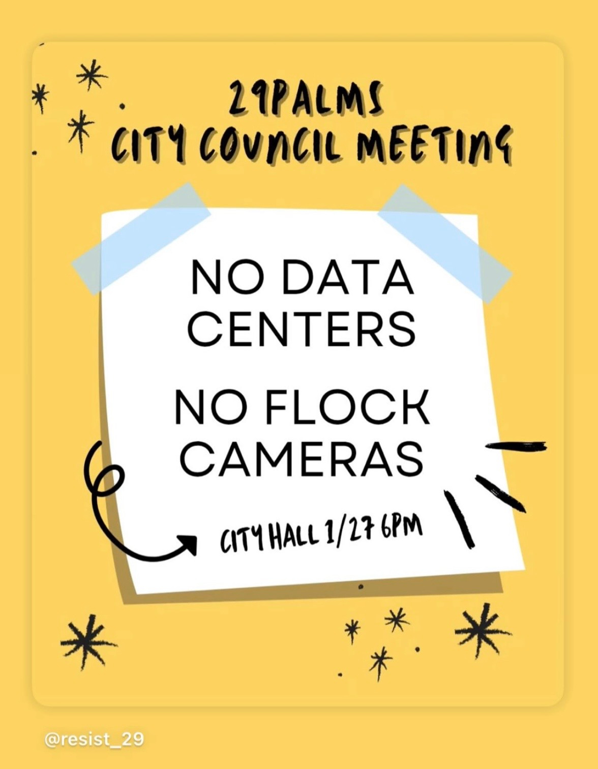 As was the case at the January 13 Council meeting, concerns about the FLOCK camera system located in Twentynine Palms are circulating on social media along with a call to attend this meeting. Because the item is not on the agenda, any comments will take place at the end of the meeting with other general public comment.