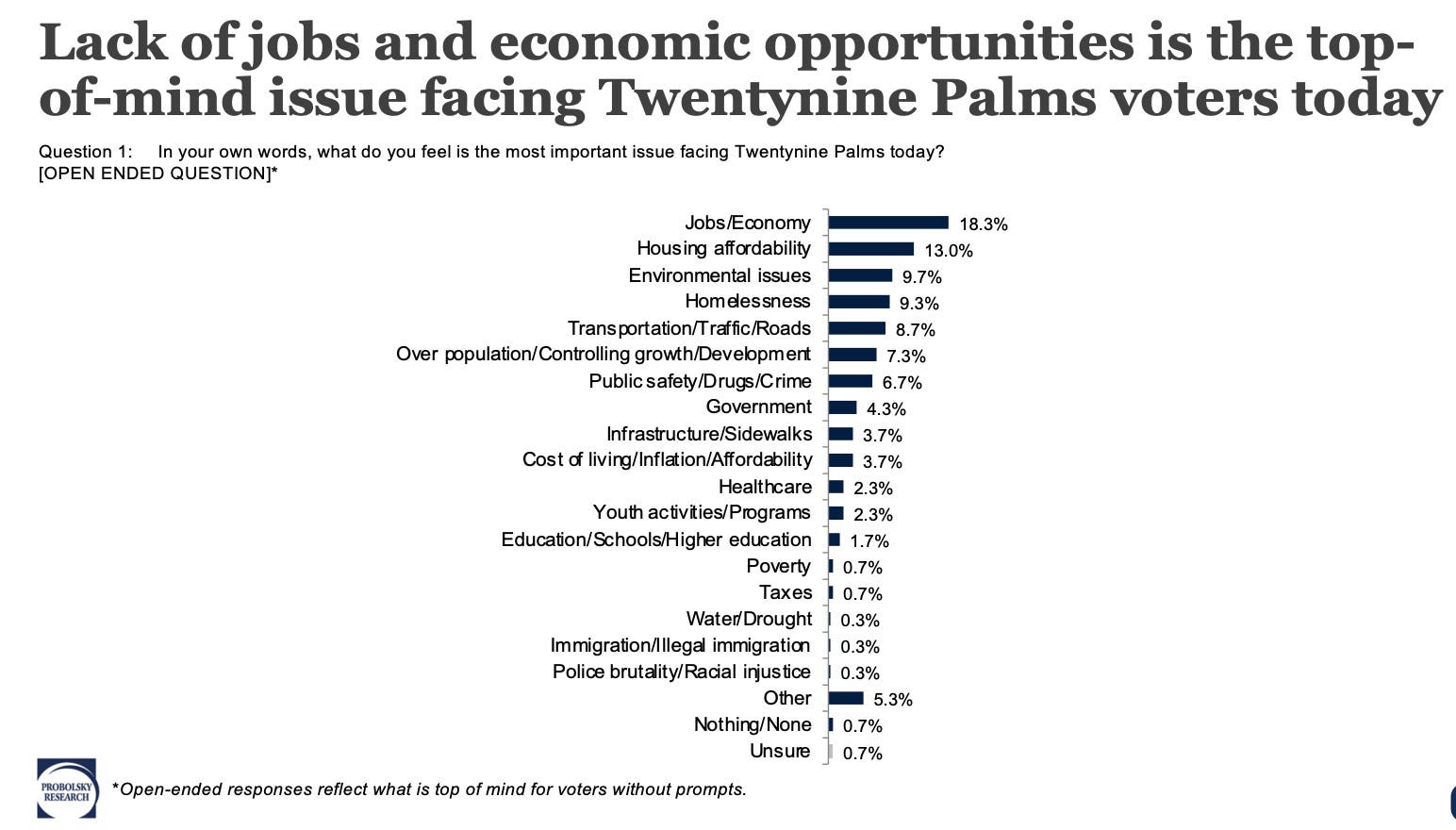 For the question, “In your own words, what do you feel is the most important issue facing Twentynine Palms today?” eighteen different topics were compiled by Probolsky from resident responses. The sales tax measure supporting City services would have little impact on the top three responses (percentage is followed by number of responses): Jobs/Economy (18.3% / 55) , Housing Affordability (13% / 39) and Environmental Issues (9.7% / 29).