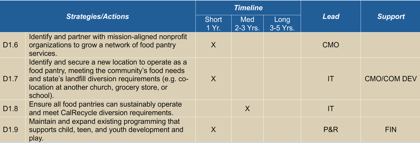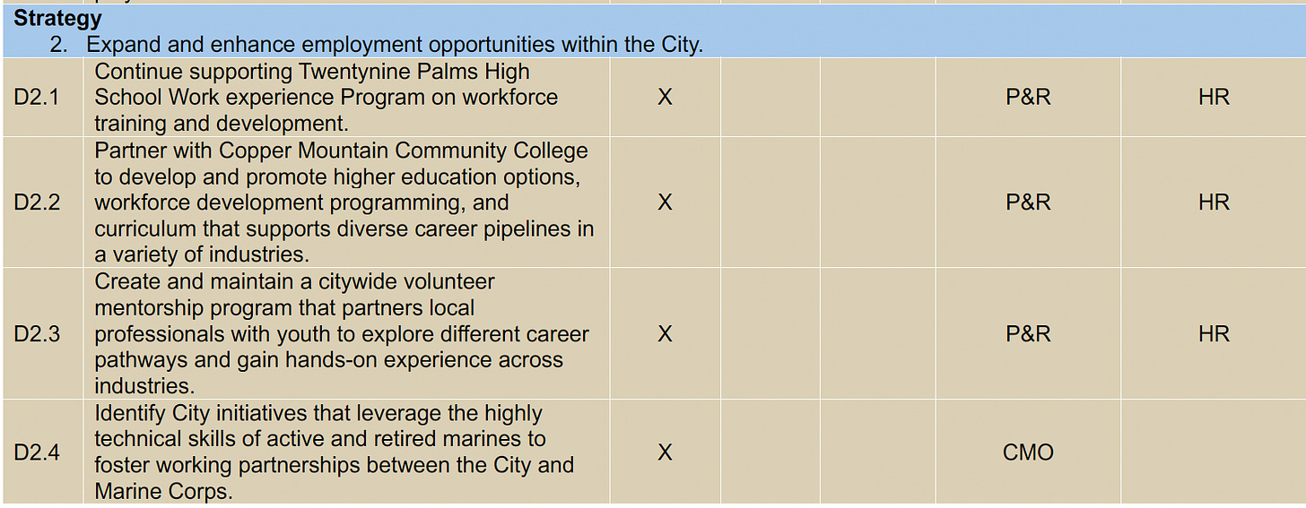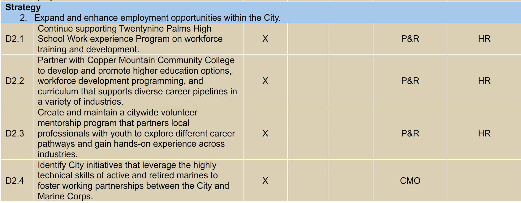 Goal D: Access to Resources – Ensure that the City of Twentynine Palms City Staff and residents have adequate resources to support daily needs and long-term wellbeing