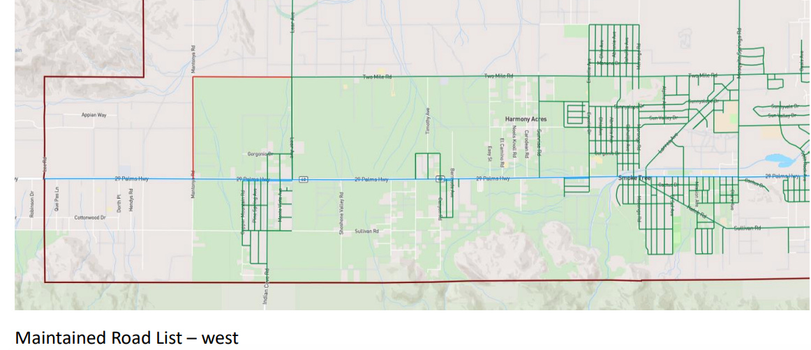 The City is required to keep a list of maintained roads, and they update it periodically. Twentynine Palms inherited this list from the County of San Bernardino when it incorporated back in 1987. Upgrades to Highway 62 are under CalTrans jurisdiction.