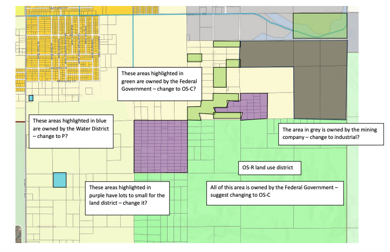 Two main examples, there is a large area on the west side of the City that has 1-acre lots that are zoned for 2 1/2 acres. Another large area on the east side of town is owned by the Federal Government that is zoned for residential development