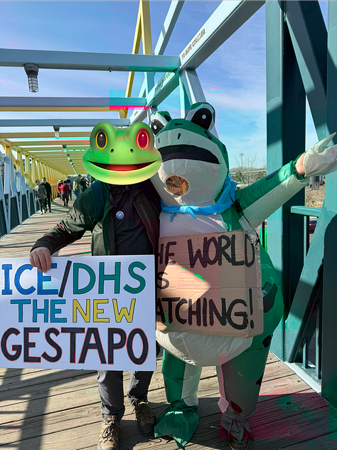 Some gatherings are joined by people wearing jolly inflatable frog costumes, a symbol of the resistance, along with signs painted with the Rebel Loon (the state bird of Minnesota) created by a local artist and based on the symbol of the Star Wars rebel alliance.1