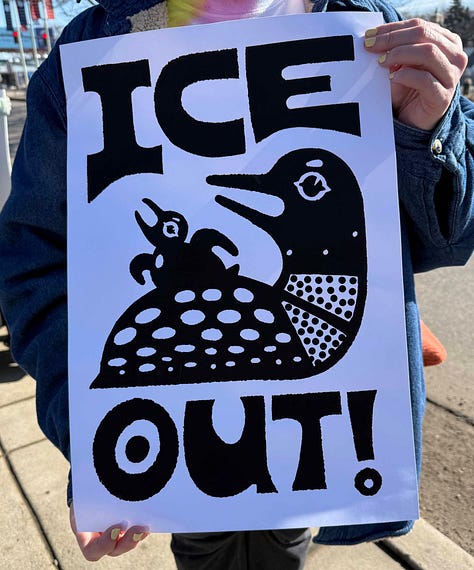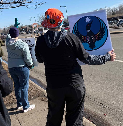 I told a woman with a Loons not Goons sign that I’d come from California to witness and take part. She hugged me and burst into tears, “it’s been so heavy,” she said. “So heavy.” I walked with her and a man wearing a fox head and a tail, and we sang one of the anthems of the Singing Resistance, “we’ll all get there together, together. No one will be left behind this time.”