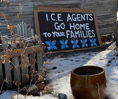 We had paid respects to Pretti the night before with our friends Dr. Montse and her wife Dr. Flores. . We silently walked around the neatly arranged stuffed animals and flowers, signs saying, “Alex, we got this” and the ubiquitous, “fuck ICE.” My heart felt as if it had been cracked open, and I sniffled into my mittens. Walking back to our car, Dr. Montse noticed a black SUV parked with the window rolled down, a man in camo watching mourners and passersby. I didn’t see him, but she, always vigilant did. “Hey,” he said. “What are you doing?” It didn’t seem friendly.