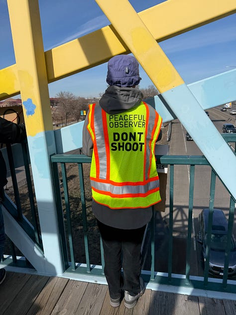 We took the light rail to the Bishop Henry Whipple Federal Building, not far from the airport. Cement barriers and tall chain link fences separate ICE, CBP, and the National Guard and protestors. Civilians patrol outside day and night, taunting law enforcement with bullhorns, sometimes reading scripted insults from clipboards. The feds cruise by in their big black SUVs, kitted out with cameras filming the crowds, capturing data, keeping tabs on their enemies.