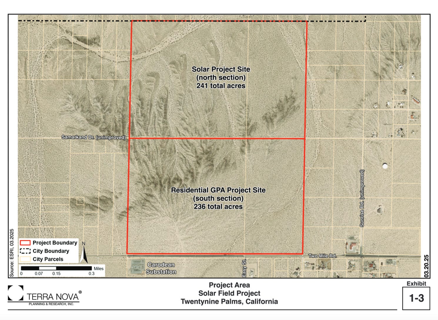 The proposed solar project is on a parcel of about 477 acres, north of Two-Mile Road near the Sugar Bowl and west of the Harmony Acres neighborhood. As previously reported by the Desert Trumpet, the City, with Terra Nova, conducted an initial study that determined the solar project could have significant environmental impacts. The solar project would be developed on 241 acres, including grading about 184 of those acres to accommodate a 50 megawatt commercial solar generation facility, including 160,000 photovoltaic solar panels mounted on 720 ground-mounted, fixed-tilt solar panel racks. Each rack is 104 feet wide and 252 feet long and would be separated by 10 foot wide service drives.
