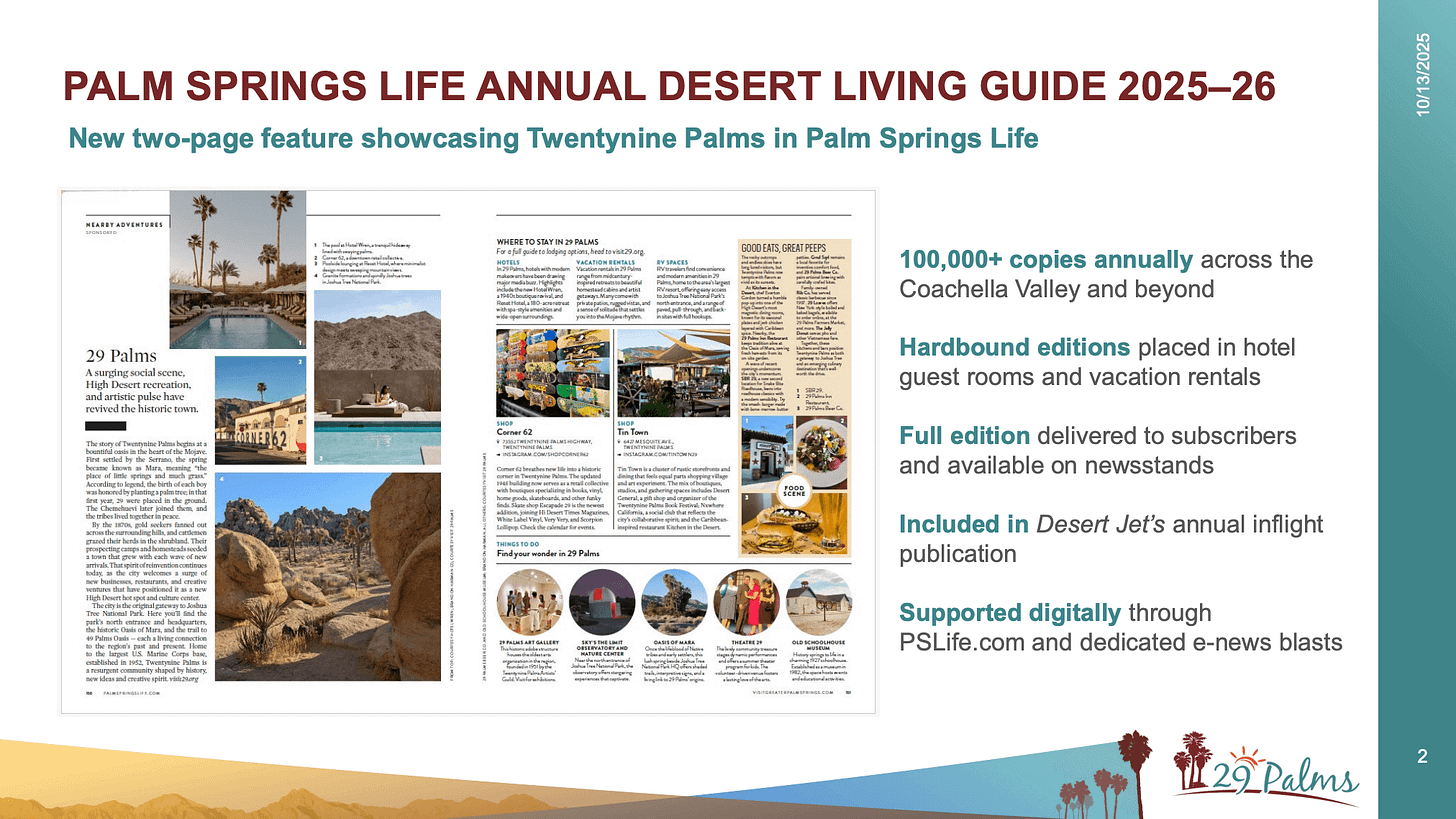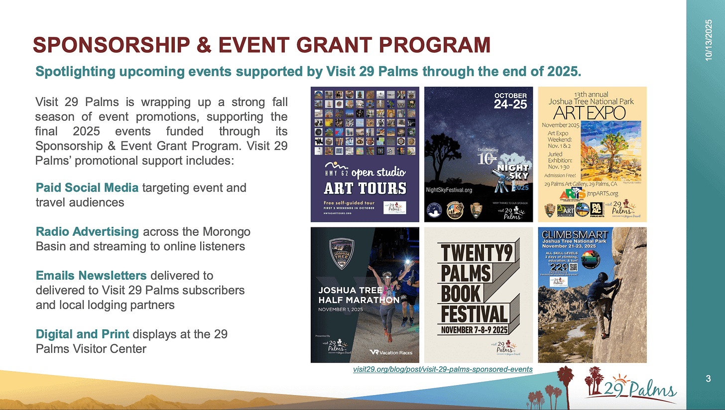 Marketing Director Breanne Dusastre shared slides and reported on the TBID’s recent marketing activities through Visit 29 Palms. Dusastre highlighted the two-page feature that Visit 29 paid for in the 2025-26 annual Palm Springs Life Desert Living Guide. She also shared the non-sponsored day trip guide, “How to Spend a Day in Twentynine Palms” the magazine recently published on their website.