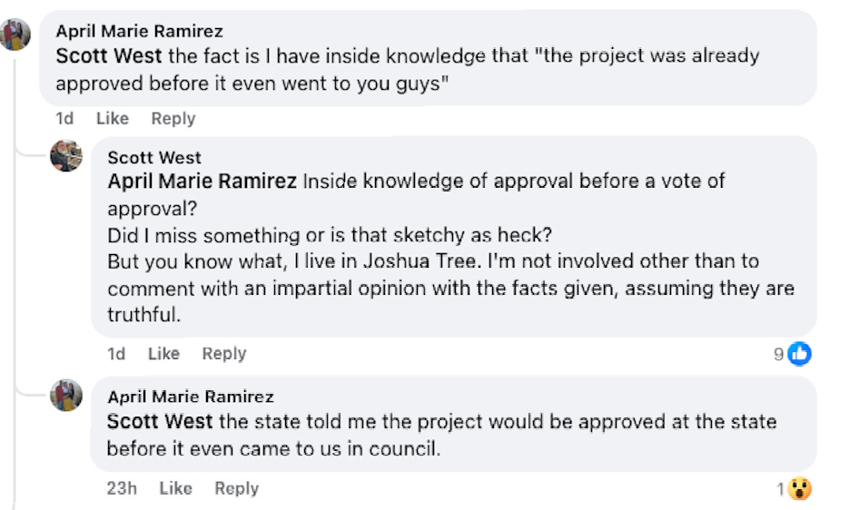 Balsley was referring to a lengthy Facebook thread started on April 11 in which Councilmember Ramirez was an active participant. As of Thursday, April 16, there were 313 comments. The Desert Trumpet made screenshots of the conversations in which Ramirez participated2. The statement quoted in Balsley’s public comment is just one of numerous posts made by Ramirez implying knowledge about state approval of the project prior to the Council vote. However there is no legal mechanism for the California Energy Commission to pre-approve a project.