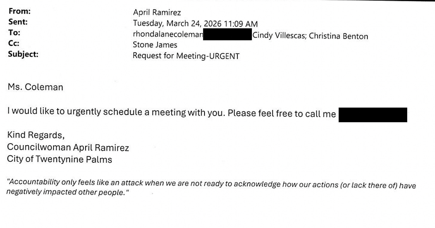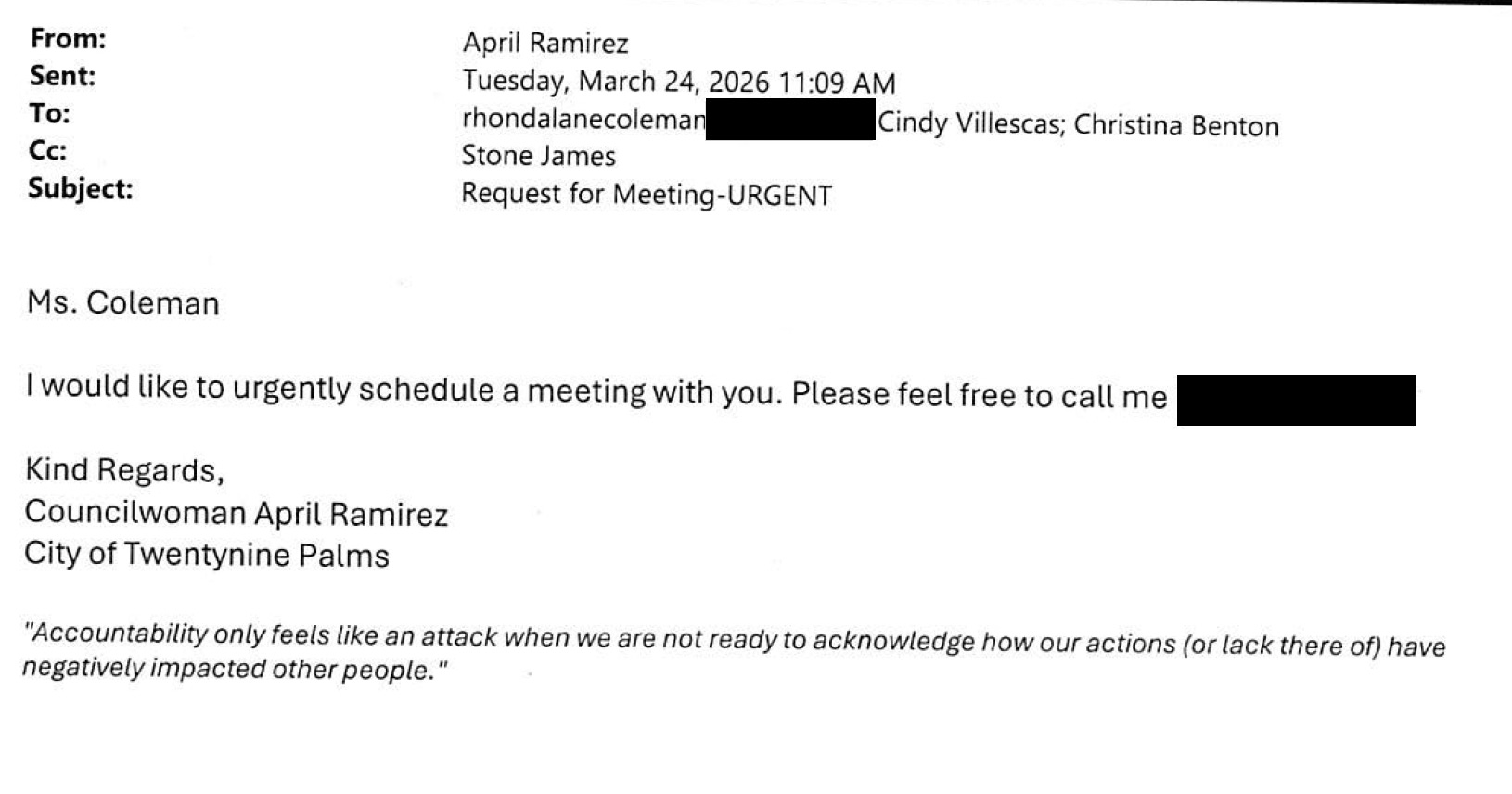 The Desert Trumpet has confirmed that Huguenor’s remarks were inspired by an interaction between Councilmember April Ramirez and resident Heather Drake over the Flock camera issue that occurred after the March 23 City Council meeting and then appeared to escalate the next day.1 On the morning of Tuesday, March 24, Ramirez emailed Drake’s employer, Groundwork Arts, with an “urgent” request for a meeting. The email was obtained by the Desert Trumpet through a Public Information Request.