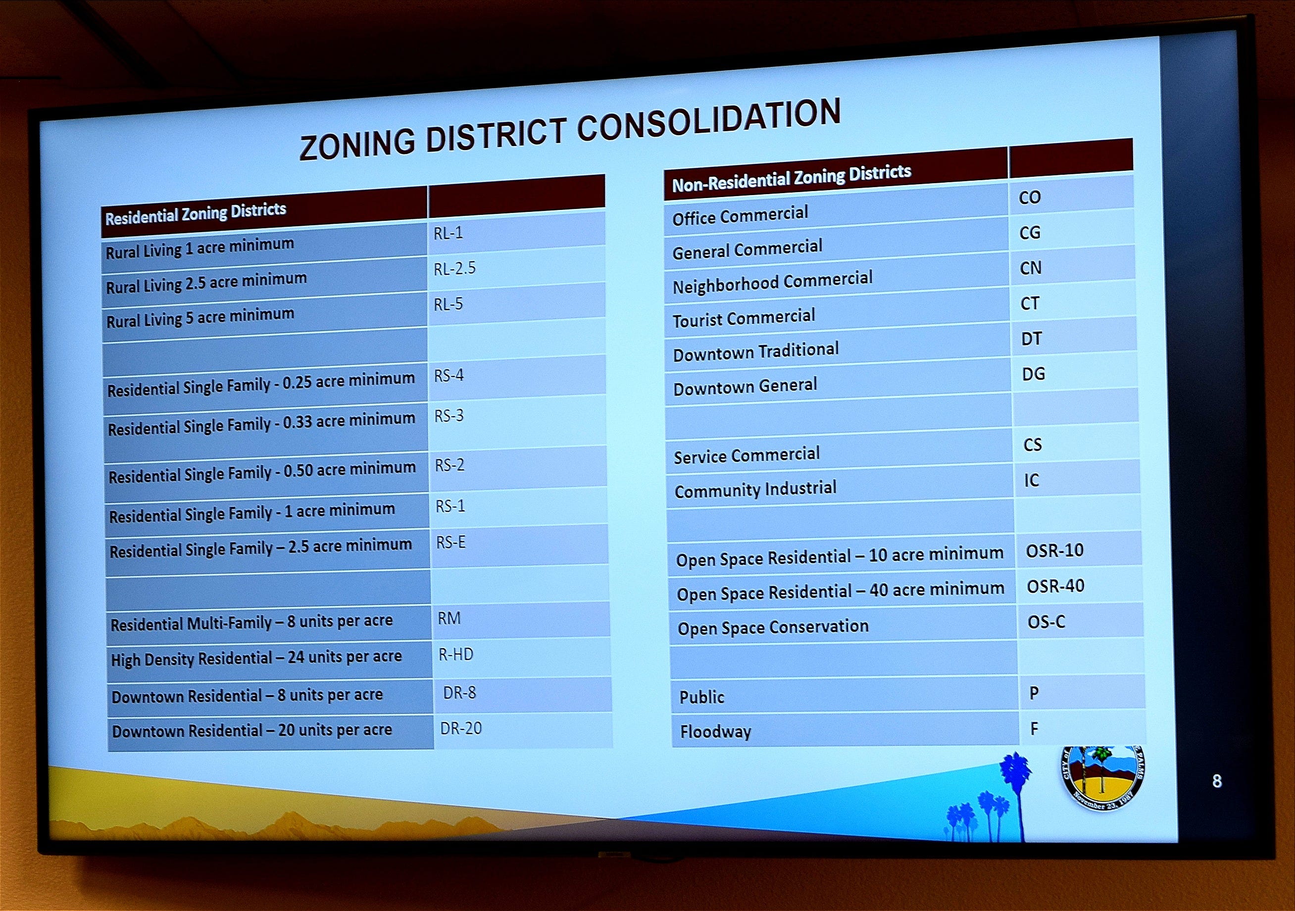 In anticipation of the City’s General Plan update, the Commission’s seemingly eternal saga of language simplification study sessions continued with this second topic— consolidation of zoning districts, particularly those designated as Rural Living 2.5 (RL 2.5) and Single Family Residential-Estate (RS-E), which are both zoned for 2.5 acres.