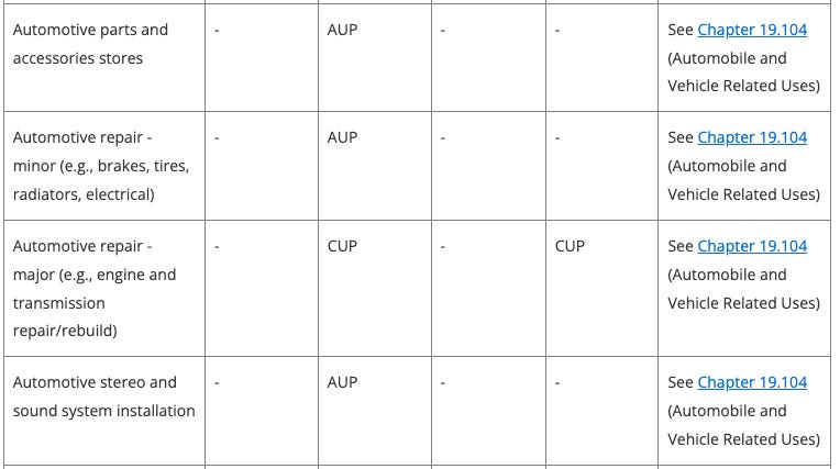 Another example above shows verbose language in automotive repairs, which distinguishes between brake installations, stereo installations, and car accessory sales even though they all require the same level of permit- AUP. City staff is suggesting language simplification, such as categorizing all of these under a “General Automotive” category instead, while engine repairs, which require a more comprehensive CUP, will remain as is.