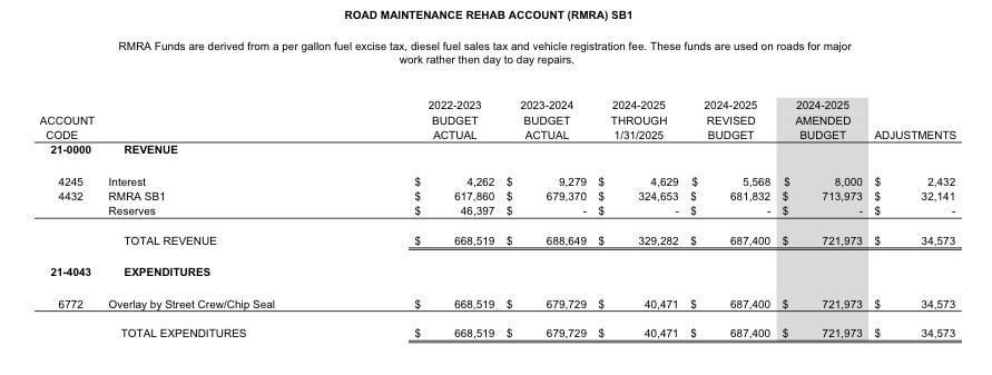 In FY ‘24-’25, $787,622 was spent using funds from the California Gas Tax. According to the published budget, funds must be spent on street repair and maintenance within the roadway, and cannot be used to widen or extend a road.