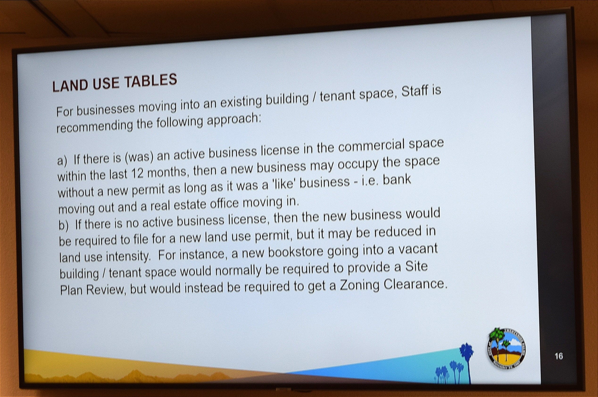 For businesses that are moving into existing buildings, City Staff is suggesting businesses be allowed to use the business permit of the previous occupant through a zoning clearance process, at no cost, rather than making them purchase a site plan review at a cost of $1,250.