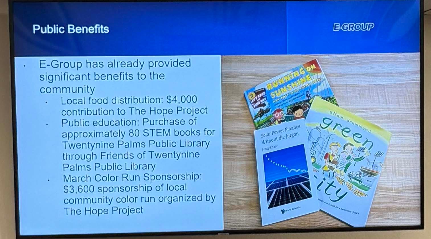 According to documentation presented by E-Group at the March 3, 2026, Planning Commission meeting, E-Group PS made more than $7,600 in donations to the Hope Project — $4,000 in direct contributions and $3,600 to help sponsor a color run.