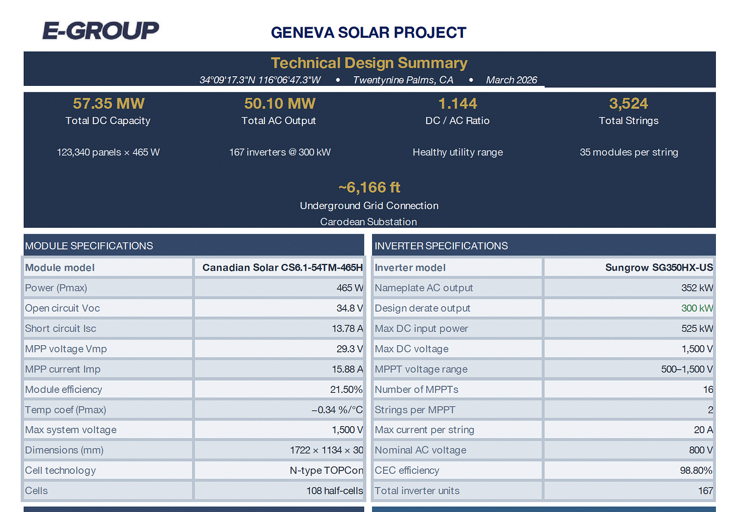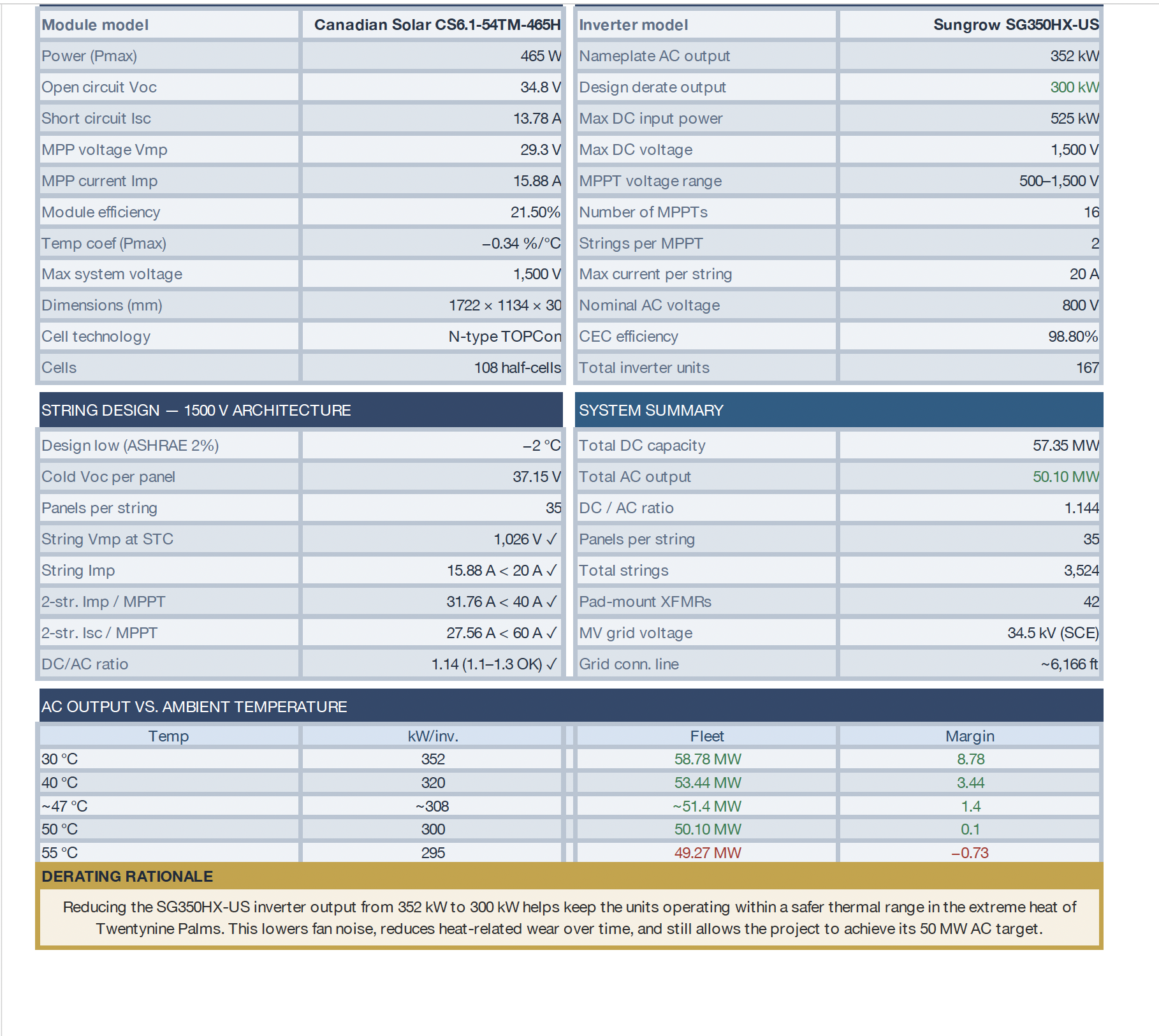 The modified project, according to E-Group’s own technical summary, is designed to produce exactly 50.10 MW AC — a margin of one-tenth of one megawatt above the threshold. The same document shows the project’s output dropping below 50 MW at sustained ambient temperatures above 50 degrees Celsius, or 122 degrees Fahrenheit, due to inverter derating in extreme heat.