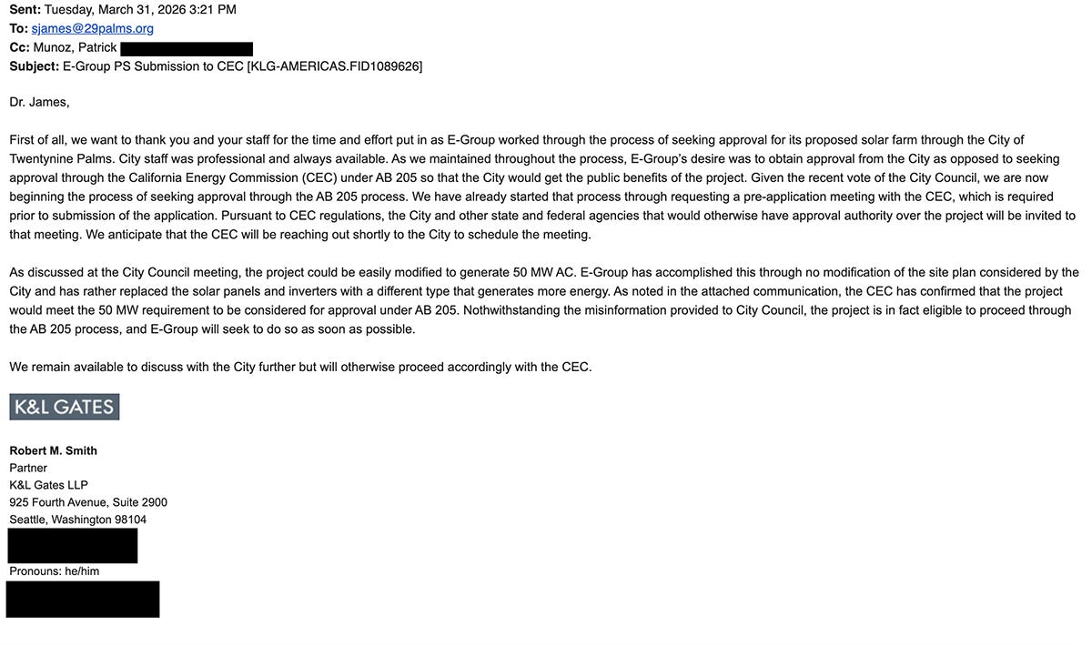 The March 31 email was sent by Robert Smith of K&L Gates LLP and cc’d to City Attorney Patrick Muñoz. In it, Smith announced that E-Group had already requested a pre-application meeting with the CEC, describing it as a required step before filing a formal application. He wrote that the project had been modified to generate 50 MW AC — the threshold required for CEC jurisdiction under AB 205 — and that “the CEC has confirmed that the project would meet the 50 MW requirement to be considered for approval under AB 205.”